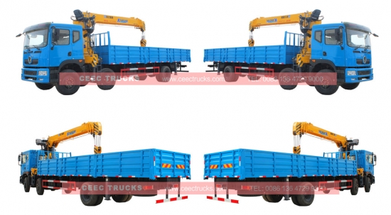 Dongfeng Teleskopmodell 12T-Auslegerkranwagen zu verkaufen, LHD- und RHD-Modell optional, schwerer CUMMINS-Dieselmotor mit 260 PS, manuelles 8-Gang-Getriebe zu verkaufen. Ausgestattet mit einem 12-Tonnen-Teleskopauslegerkran. Vom Kunden gewünschtes Frachtkastenmodell mit einer Länge von bis zu 8000 mm, mit Fernbedienung nach Wahl des Kunden