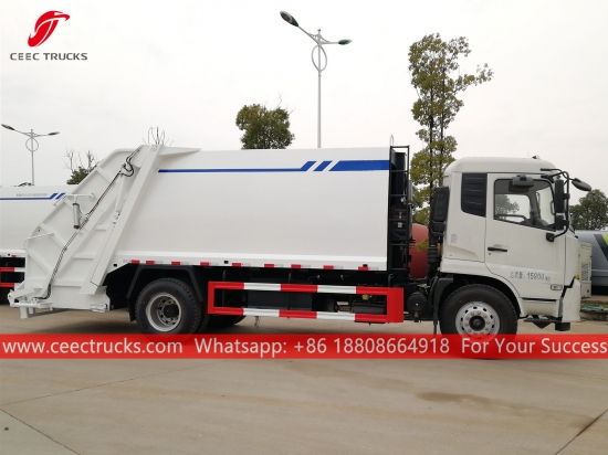Dongfeng Marke 12cbm Müllkompressor-LKW, das LKW-Chassis verwenden CUMMINS-Dieselmotor mit 210 PS, manuelles 6-Gang-Getriebe. Siemens Technologie-SPS-Steuerbox für einfache Bedienung, alle Lackierungen und Logos basierend auf den Anforderungen des Kunden.