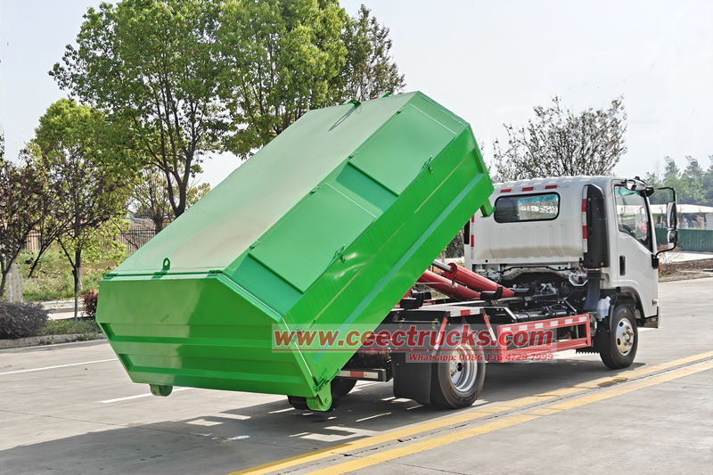 Der Müllwagen mit Hakenlift Isuzu NPR ermöglicht durch ein vollhydraulisches Steuerungssystem schnelles Be- und Entladen sowie Entleeren von Mülltonnen.