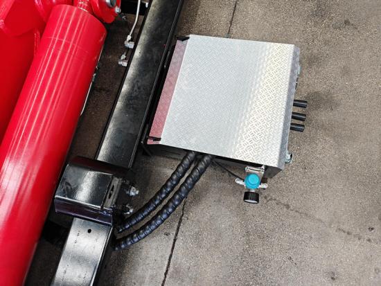 Der Oberwagen des 6-Tonnen-Rollhakenladers bildet das zentrale Bedienelement des Fahrzeugs und besteht im Wesentlichen aus einem Hakenarmrahmen, einem Hydrauliksystem und einem Verriegelungsmechanismus. Der Hakenarmrahmen lässt sich flexibel ausfahren und drehen und ermöglicht so das präzise Einhängen des jeweiligen Abfallbehälters. Das Hydrauliksystem versorgt den Hakenarm mit Energie für das Heben, Senken und Kippen und gewährleistet so einen reibungslosen Betrieb. Der Verriegelungsmechanismus sichert den Abfallbehälter während des Transports und verhindert ein Verrutschen.