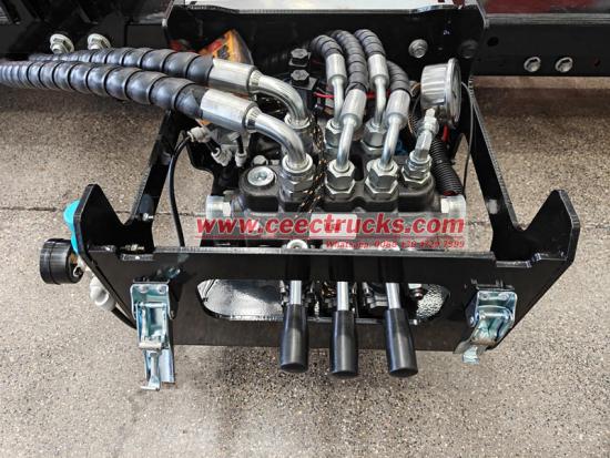 Dieses Hochdrucköl wird über Hydraulikleitungen zu den Hydraulikzylindern geleitet und steuert deren Ausfahr-, Dreh- und Hebe-/Senkbewegungen. Gleichzeitig regelt es das Öffnen und Schließen des Verriegelungsmechanismus zum Einhaken, Anheben und Sichern des Abfallbehälters. Der gesamte Vorgang wird präzise vom Hydrauliksystem gesteuert, wodurch eine reibungslose und kontinuierliche Bewegung gewährleistet wird.