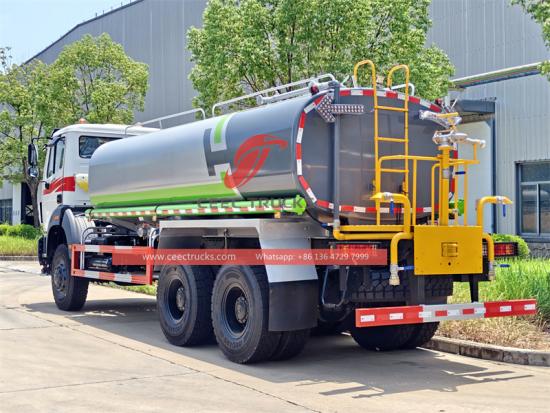 Also Der Wassertanker basiert auf Das Beiben 6x6-Allradfahrgestell, bei dem alle Räder die Antriebskraft übertragen, verbessert die Traktion und Steigfähigkeit auf Oberflächen mit geringer Haftung (Schlamm, Schnee, Sand und Eis) erheblich und verhindert so ein Rutschen oder Einsinken. Beiben-Offroad-Fahrgestelle bieten typischerweise eine hohe Bodenfreiheit, sodass sie Hindernisse auf unebenen Straßen (wie große Felsen, tiefe Spurrillen und umgestürzte Bäume) leicht umfahren können, was das Risiko des Aufsetzens verringert und das Fahrgestell und den unteren Tank schützt. Oft werden Mehrblattfedern oder hydropneumatische Federungen verwendet, die eine erhöhte Ladekapazität und ausgezeichnete Stoßfestigkeit bieten, sodass sie den harten Stößen unbefestigter Straßen standhalten und die Fahrzeugstruktur und die Tankausrüstung schützen. Die großen Böschungswinkel erleichtern das Auf- und Abfahren steiler Hänge und buckliger Straßen und vermeiden Kollisionen zwischen den vorderen und hinteren Stoßfängern.