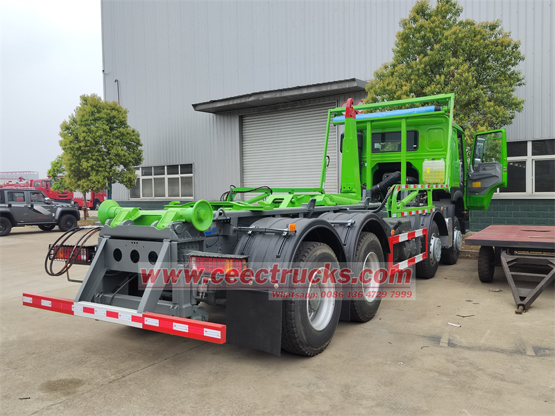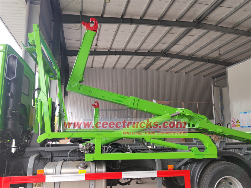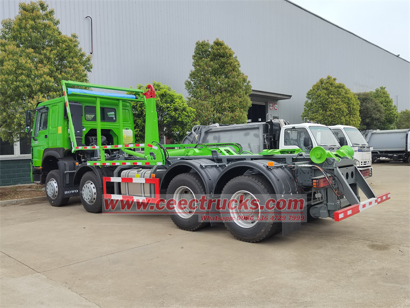 Der HOWO 8x4 Schwerlast-Müllwagen mit Armhub ist ein Schwerlast-LKW mit abnehmbarem Fach, der auf dem Fahrgestell der Sinotruk HOWO-Serie basiert. Es hat zwei Funktionen: Selbstentladen der Ware und automatisches Be- und Entladen der Box (Vollbe- und -entladung). HOWO 8x4 LKW-Hakenlader ist eine gängige Maschine im Baubereich. Sie werden am häufigsten zum Heben von Materialien für Bauprojekte verwendet, können aber aufgrund ihrer Vielseitigkeit auch für verschiedene andere Aufgaben eingesetzt werden. Diese Ladertypen sind mit einem horizontalen Ausleger ausgestattet, der am Heck des Fahrzeugs montiert ist und über die Kabine reicht. Die Maschine ist dann in der Lage, Materialien anzuheben, indem sie sie mit Ketten oder Haken am Ende ihres Arms festhält. Maßgeschneiderte HOWO 8x4-Hakenlift-Müllwagen können ein maximales Gewicht von 30 Tonnen laden, Mülltonnen können mit einer Länge von 6000 mm ausgelegt werden und eignen sich sehr gut für die normale Müllsammlung und den normalen Transport.
