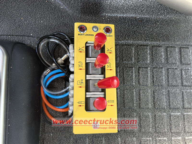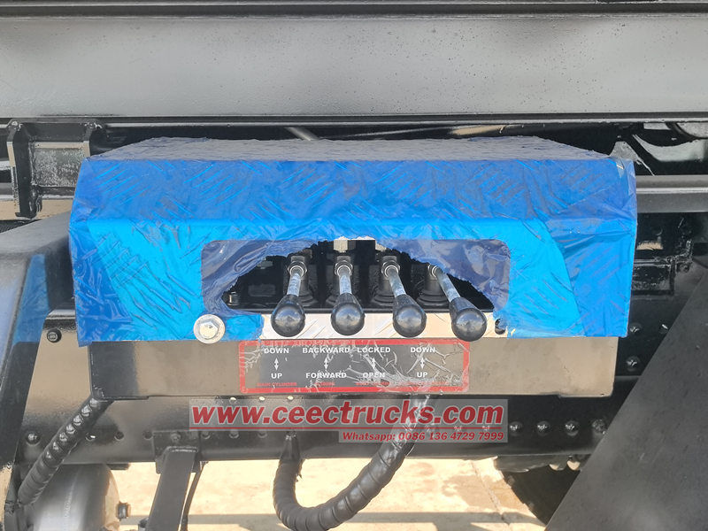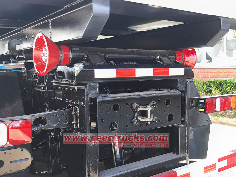 Der Lkw ist mit elf 12.00R20-Reifen ausgestattet, was eine höhere Ladekapazität und Anpassungsfähigkeit an unterschiedliche Straßenverhältnisse ermöglicht. Er verfügt über einen separaten Aufbau und ein separates Fahrgestell sowie einen hydraulischen Hakenarm am Heck, der ein schnelles Be- und Entladen sowie den Transport von Abfallbehältern ermöglicht.