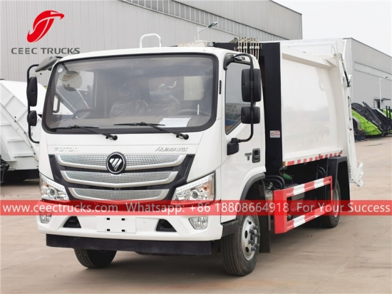 FOTON 8cbm Müllverdichtungswagen, das LKW-Chassis verwendet einen 141-PS-Dieselmotor von CUMMINS und ein manuelles 6-Gang-Getriebe. SPS-Steuerbox für einfache Bedienung. Alle Gemälde und Logos basierend auf den Anforderungen des Kunden.