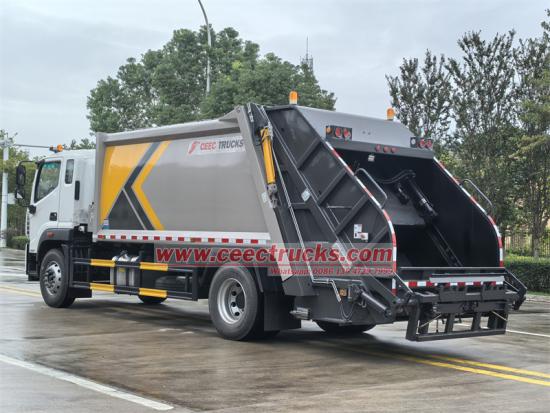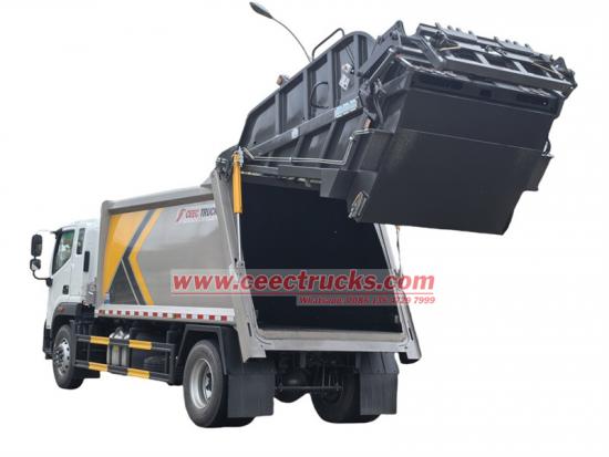 Rear tilting device for 360L and 1100L metal binsDer FOTON 16CBM Müllverdichter ist ein besonders robustes Abfallentsorgungsgerät, basierend auf dem 4x2-LKW-Chassis Modell 1086VLPHK-0FDA01. FOTON AUMAN Hecklader-Lkw Ausgestattet mit einem 270 PS starken CUMMINS ISDe270 30 Dieselmotor mit Turboaufladung und Ladeluftkühlung, 6700 cm³ Hubraum, bietet das Fahrzeug auch in bergigem Gelände hohe Leistung. Das ZF 8-Gang-Schaltgetriebe, die Vorderachse mit 4,2 Tonnen und die Hinterachse mit 9 Tonnen Tragfähigkeit sowie die 295/80R22.5-Reifen gewährleisten eine hohe Belastbarkeit. Der 16 m³ große, geschwungene Verdichteraufbau aus T420-Stahl (4 mm Wandstärke, 5 mm Bodenstärke) verfügt über ein Zweiwege-Ausgleichsventil und einen optoelektronischen Schalter für mehr Sicherheit. Die Heckkippvorrichtung ermöglicht das Beladen mit 360-l- und 1100-l-Mülltonnen und eignet sich ideal für die lokale Müllabfuhr und den Transport in Gemeinden und Betrieben. Das CAN-BUS-Steuerungssystem und die hydraulische Ventilsteuerung machen das FOTON 16000L Abfallentsorgungsfahrzeug in Santiago de Chile zu einem beliebten und zuverlässigen Fahrzeug.