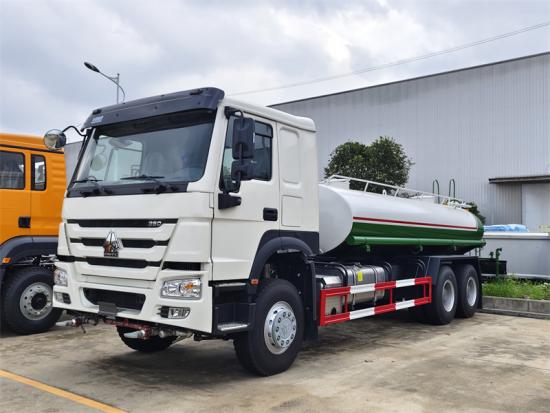 HOWO HW76, NX cabin is optionalDer HOWO 6×4 Wassertankwagen ist ein multifunktionales, umweltfreundliches Entsorgungsfahrzeug auf Basis des SINOTRUK HOWO ZZ1257 6×4-Antriebsfahrgestells. Er ist mit einem 20.000-Liter-Wassertank aus Kohlenstoffstahl, einer Wasserpumpe vom Typ 80QZ60/90 und einer Sprinkleranlage ausgestattet. Das Fahrzeug saugt mithilfe seiner Bordpumpe Wasser aus externen Quellen an und befördert es unter Druck zu Front-, Heck- und Seitensprinklern sowie einer Wasserkanone mit einer Reichweite von mindestens 35 Metern. Dadurch sind verschiedene Sprühmodi möglich.