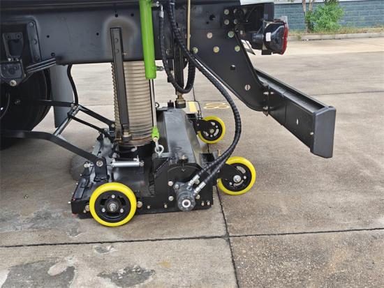 Insgesamt 4 mechanische Bürsten und 1 Saugscheibe sind hinten montiert. Der Antrieb erfolgt über einen Hydraulikmotor. Die Geschwindigkeit ist einstellbar und unabhängig steuerbar. Eine automatische Ausweichfunktion ist ebenfalls vorhanden. |