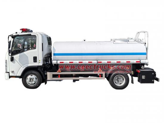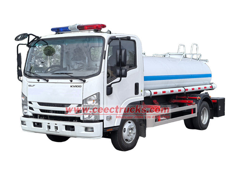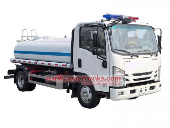 Isuzu KV100 Wassertankwagen mit Sprinkleranlage. Er basiert auf dem neuen Isuzu KV100-Chassis, hat einen 120-PS-Motor (4KH1CN6LB), einen Reihenvierzylinder-Viertaktmotor und ein 5-Gang-Getriebe (Isuzu MSB). Der obere Teil ist ein 5-cbm-Wassertank aus Edelstahl. Ausgestattet mit einem Edelstahlfilter und einer 40/50-Wasserpumpe aus Edelstahl. Rote und blaue Warnleuchten befinden sich oben auf der Kabine.