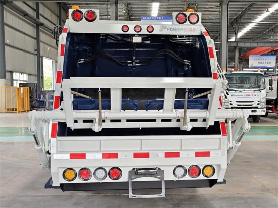 Semi-sealed bucket flip mechanismDo e Der leichte Müllverdichter ISUZU NPR ist ein Müllwagen für den städtischen Einsatz mit hervorragender Leistung. Er ist mit einem 4HK1-TCG61-Motor mit einer maximalen Leistung von 190 PS und einem Hubraum von 5,19 Litern ausgestattet. Er verfügt über einen 4-Zylinder-Reihen-Turbomotor mit Ladeluftkühler. Das Gesamtgewicht des Fahrzeugs beträgt 11 Tonnen, die tatsächliche Nutzlast 4,9 Tonnen. Das Fahrgestell ist mit 4x2-Antrieb ausgestattet und der Radstand beträgt 3815 mm. Der Mülleimer hat ein Fassungsvermögen von 10 Kubikmetern und besteht aus gebogenen, integrierten Stahlplatten. Boden und Seitenplatten bestehen aus 4 mm starkem Q235-Spezialstahl. Das Kompressionsverhältnis beträgt 1:3,4.