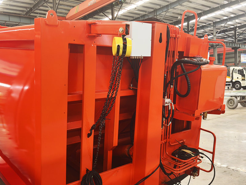 Die Aufbauten der Hecklader-Müllpressen bestehen aus verschweißten, hochfesten Stahlplatten und bilden so eine robuste und langlebige Konstruktion mit hervorragender Abdichtung, die das Austreten von Abwasser und Gerüchen wirksam verhindert. Der Innenraum ist korrosions- und rostgeschützt und mit einem hocheffizienten Kompressionsmechanismus ausgestattet, der das Müllvolumen deutlich reduziert und die Ladeeffizienz steigert. Der Aufbau hat ein Fassungsvermögen von 8 m³ und unterstützt verschiedene Be- und Entlademethoden, um unterschiedlichen Betriebsanforderungen gerecht zu werden.