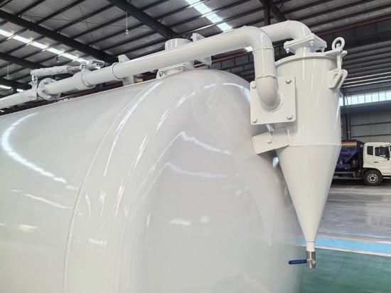Der Aufbau des Fäkalientankwagens besteht im Wesentlichen aus einem 10 m³ großen Vakuumtank, einer Vakuumpumpe, einem Saugschlauch und einem Hydrauliksystem. Der Tank ist aus hochfestem Stahl gefertigt und gewährleistet so eine hervorragende Abdichtung gegen Sekundärverschmutzung. Die MORO-Vakuumpumpe sorgt für eine starke Saugleistung und entfernt Schlamm, Fäkalien und Suspensionen schnell und effizient. Das Saugrohr lässt sich flexibel an verschiedene Einsatzszenarien anpassen.