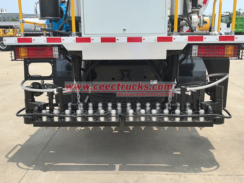 Das Heck des Bitumenverteiler-Tankwagens Shacman X3000 ist mit einer einziehbaren Sprühstange mit einstellbarer Breite ausgestattet, die mit mehreren Sätzen hochpräziser Durchflussregeldüsen ausgestattet ist. Es kann das Sprühvolumen und die Abdeckung entsprechend den Konstruktionsanforderungen (wie z. B. durchlässige Schicht, Klebeschicht und Dichtungsschicht) präzise einstellen und eine variable Sprühmenge von 0,2–3 l/m² über einen weiten Bereich erreichen.