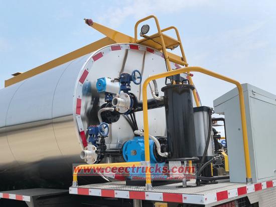 Der intelligente Asphaltstreuwagen besteht aus einem Fahrzeugchassis, einem Asphalttank, einem Asphaltpump- und Sprühsystem, einem Thermoölheizsystem, einem Hydrauliksystem, einem Verbrennungssystem, einem Steuerungssystem, einem pneumatischen System und einer Bedienplattform. |
