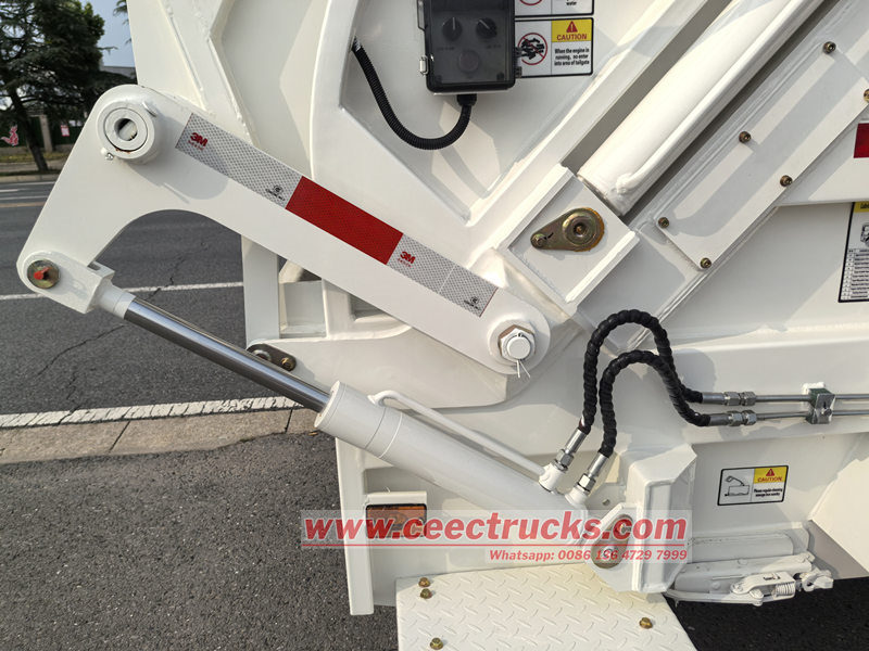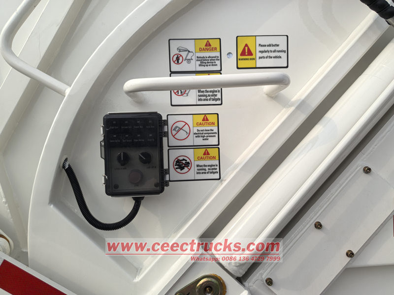Der Bedienkasten ist in der Kabine und am Fahrzeugheck installiert. Der Bedienkasten in der Kabine steuert das Schieben und Entladen sowie die Betriebsart (z. B. automatisch oder manuell). Der Bedienkasten am Fahrzeugheck steuert den Press- und Füllmechanismus sowie den Fassdrehmechanismus. Die Bedienung ist sehr komfortabel. Insbesondere auf Deponien können Bediener das Entladen und die Abwasserentsorgung durchführen, ohne das Fahrzeug verlassen zu müssen. Kabelgebundene Fernbedienungen können je nach Benutzeranforderungen installiert werden.